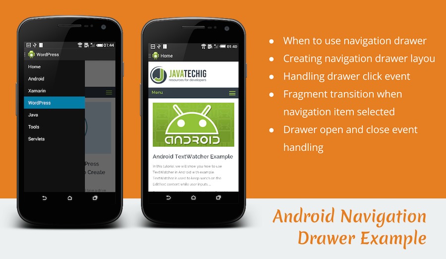 The following example explains, how to implement a navigation drawer using Android Support Library DrawerLayout API.